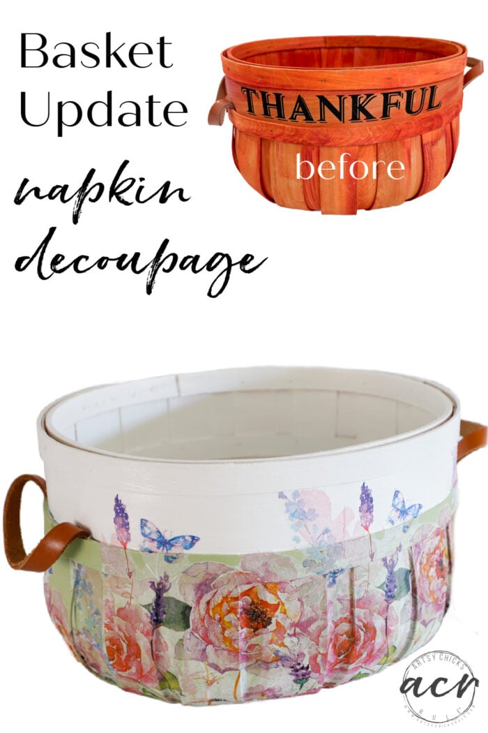 Pretty little basket update for spring! Fresh paint and a colorful spring floral napkin create a beautiful new look!