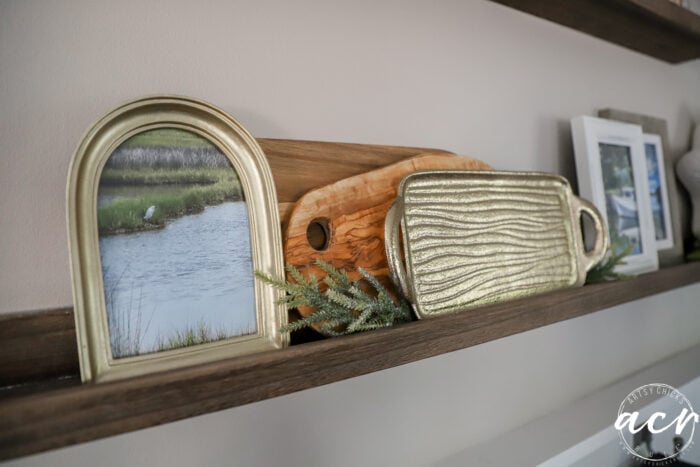 I left the greenery on the mantel, removed the stockings, the Christmas pillow below, and the holiday-style figurine on the other side.