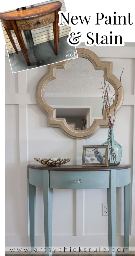 Good save, Nancy! I wonder though, why you didn’t leave the drawer unpainted so it would match the top. I like what you achieved. Demi-lunes are a great space saver and fill in.